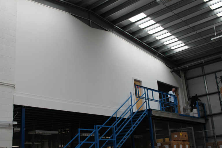After moving to new premises, our client contracted mezzaninefloor.ie to design, supply and install a 150 sq. metre mezzanine floor with 4.3M finished floor level. The finished floor level was designed to match the existing office floor level as access to the floor was to be achieved through an ope broken through the existing wall. The mezzanine was completed with a straight stairs with a mid-landing and a custom designed sliding pallet gate mechanism.